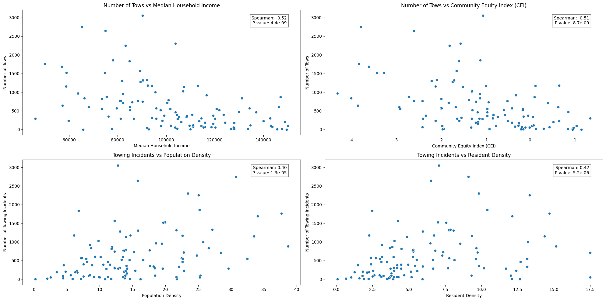 The number of cars towed from a census tract is more highly correlated with the median household income, language spoken at home, and CEI score than with population or resident density.